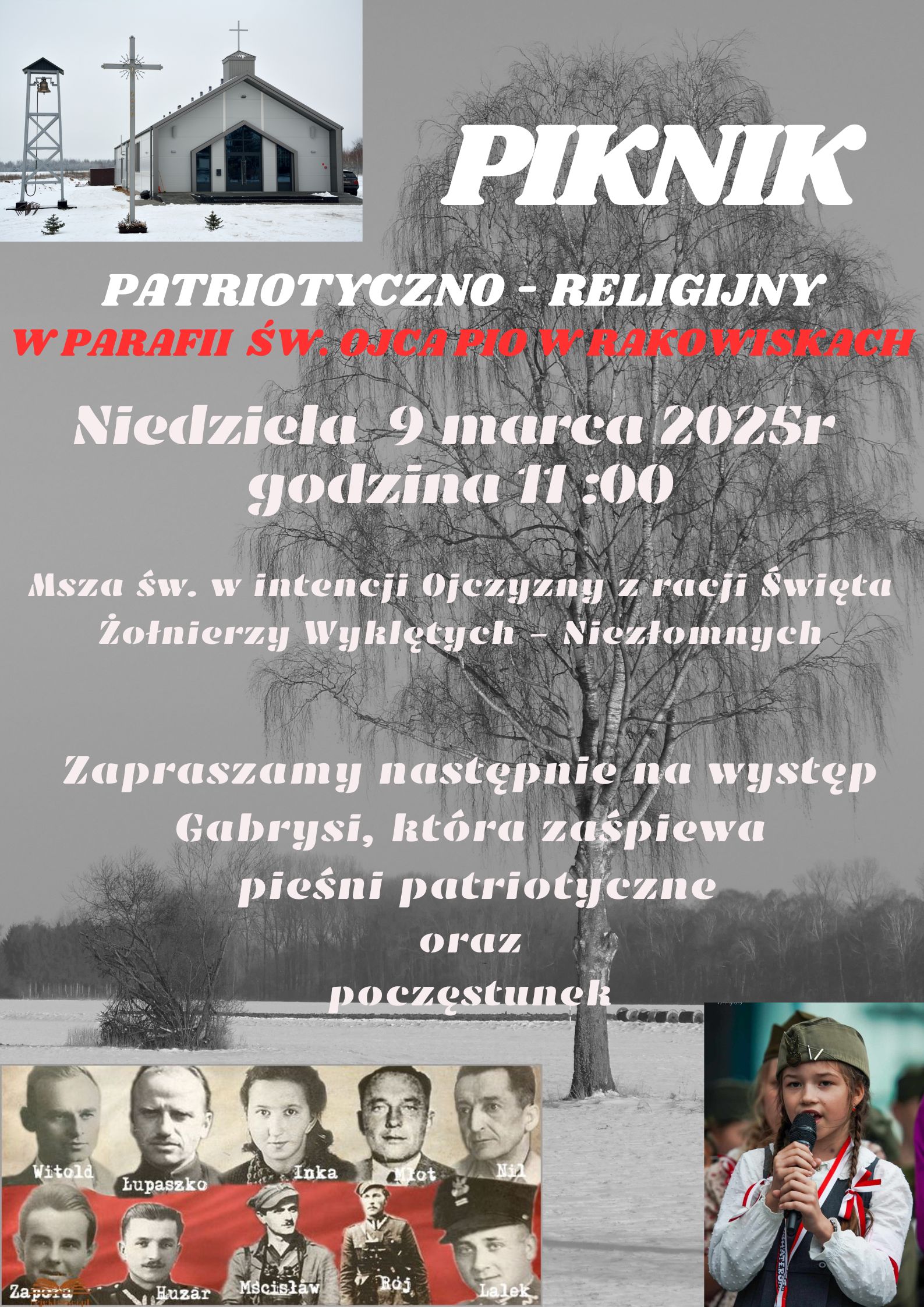 W przyszła niedzielę o godz. 11:00 Msza św. w intencji Ojczyzny z racji Święta Żołnierzy wyklętych ( niezłomnych) z udziałem pocztów sztandarowych. Po Mszy św. zostaną zaprezentowane pieśni patriotyczne. Wystąpi Gabrysia z mamą. Po wysłuchaniu pieśni zapraszamy na poczęstunek .